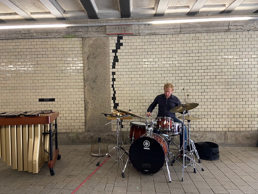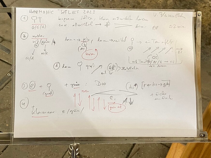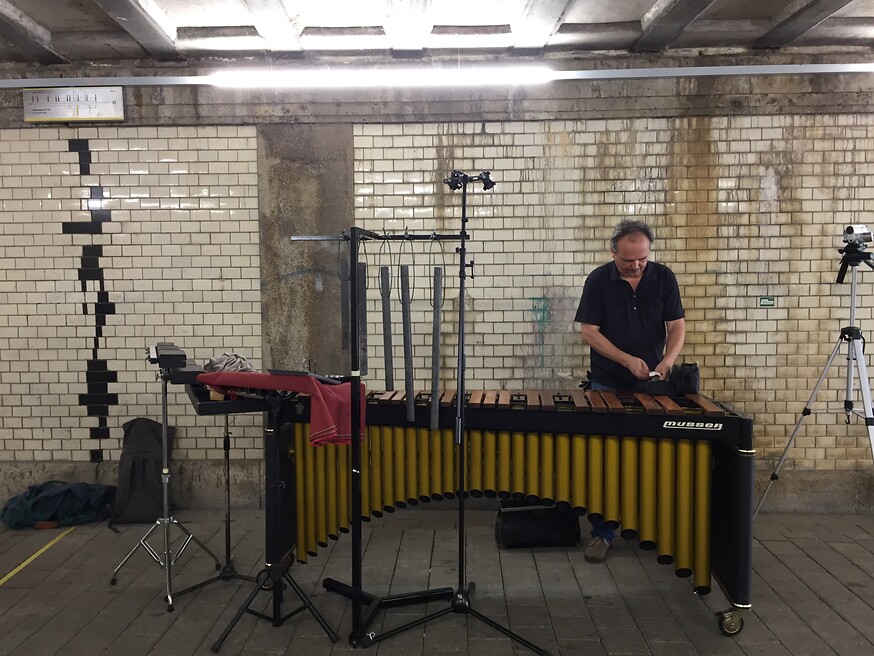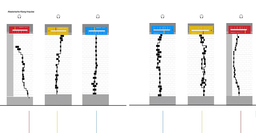 Die Wandbilder dienen als stimulierende Grafiken und werden von den Interpretinnen und Interpreten individuell und durch spontane Aktionen musikalisch umgesetzt. In unregelmäßigen Abständen sind Musikerinnen und Musiker eingeladen in situ zu den Notationen der schwarzen Fliesen zu improvisieren und diese neu einzuspielen.
