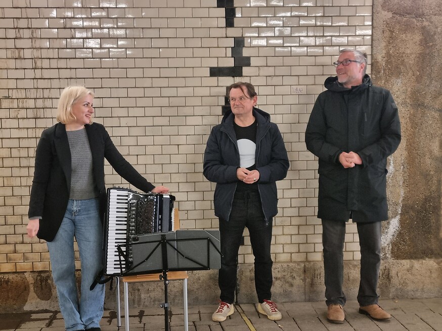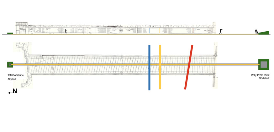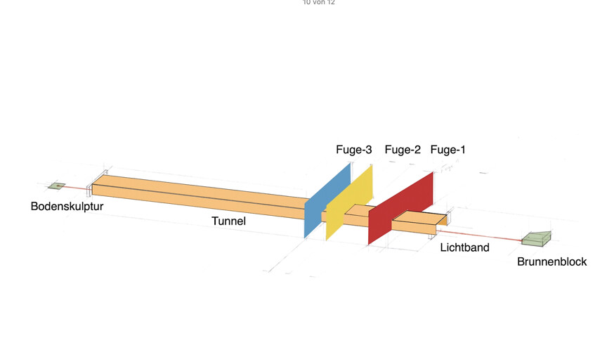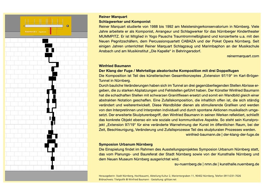 Durch verschiedene bauliche Veränderungen haben sich im südlichen Bereich des Karl-Bröger-Tunnels, an drei sich gegenüber liegenden Stellen Abrisse ergeben. Diese haben zu Schadstellen und Absprengungen an den Wandfliesen geführt. Verschiedene Experimente und Versuchsanordnungen im Tunnel haben so zu einer Komposition geführt, deren zentraler Bestandteil die drei Doppelfugen im südlichen Ausgangsbereich des Tunnels sind.