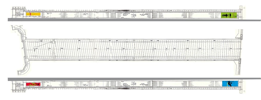 Durch das Ersetzen der schadhaften und fehlenden Wandfliesen mit schwarzen Fliesen entstand ein Wandbild gleich einer abstrakten Notenschrift. Eine Zufallskomposition deren Form offen ist, die sich auch in Zukunft weiter entwickeln und verändern wird. Die statischen Bewegungen in diesem Bereich können gemindert, aber nicht ausgeschlossen werden. Die Veränderungen werden einen dynamischen Verlauf nehmen und somit wird sich auch die Komposition verändern und zu immer wieder neuen Interpretationen führen.