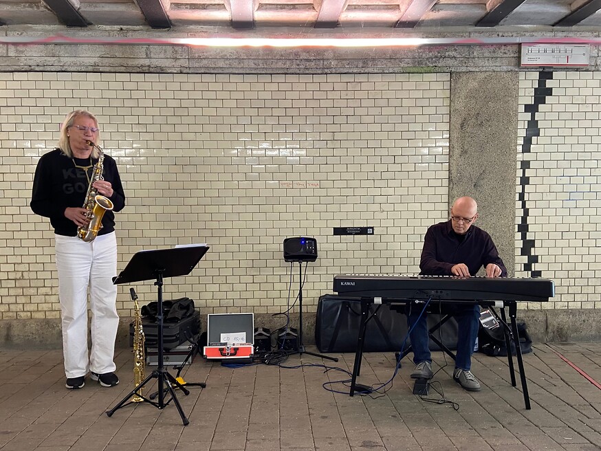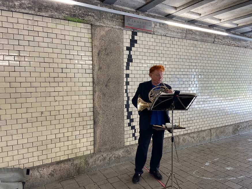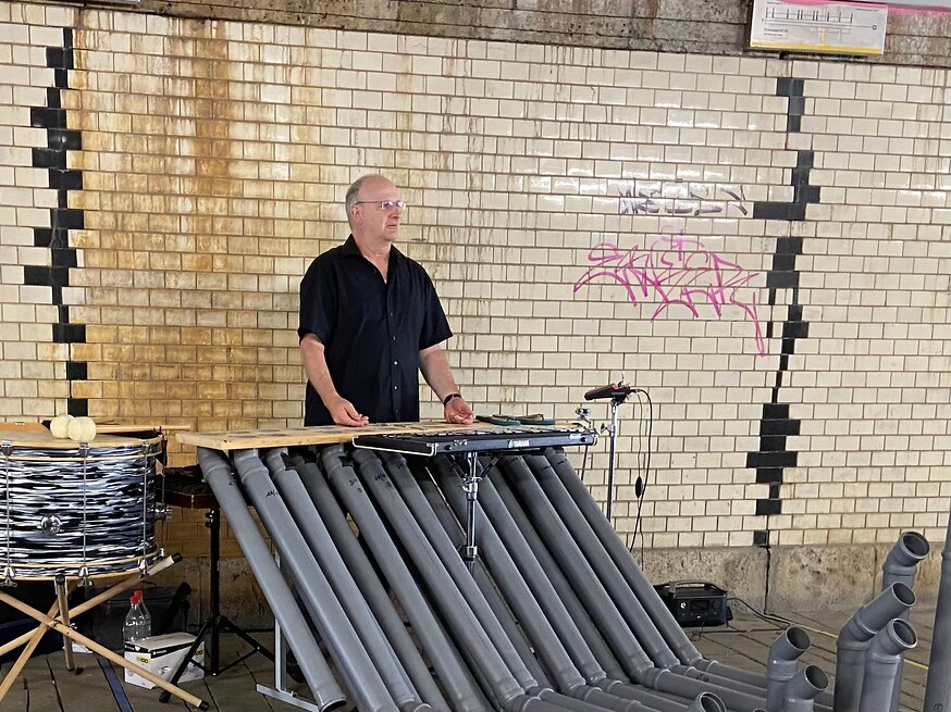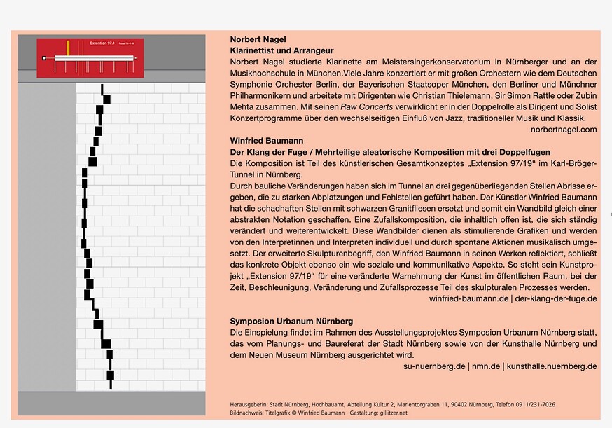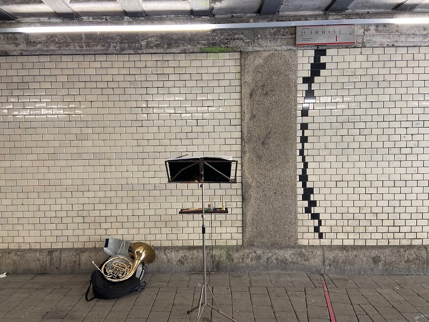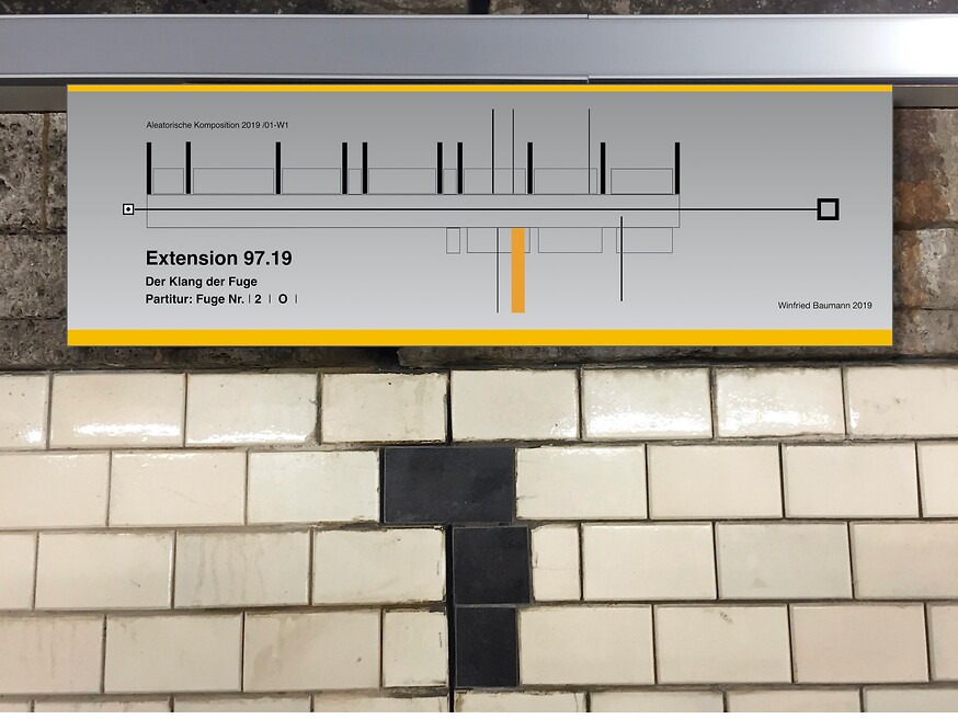 Die Wandbilder dienen als stimulierende Grafiken und werden von den Interpretinnen und Interpreten individuell und durch spontane Aktionen musikalisch umgesetzt. In unregelmäßigen Abständen sind Musikerinnen und Musiker eingeladen in situ zu den Notationen der schwarzen Fliesen zu improvisieren und diese neu einzuspielen.