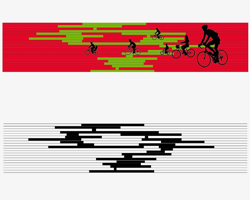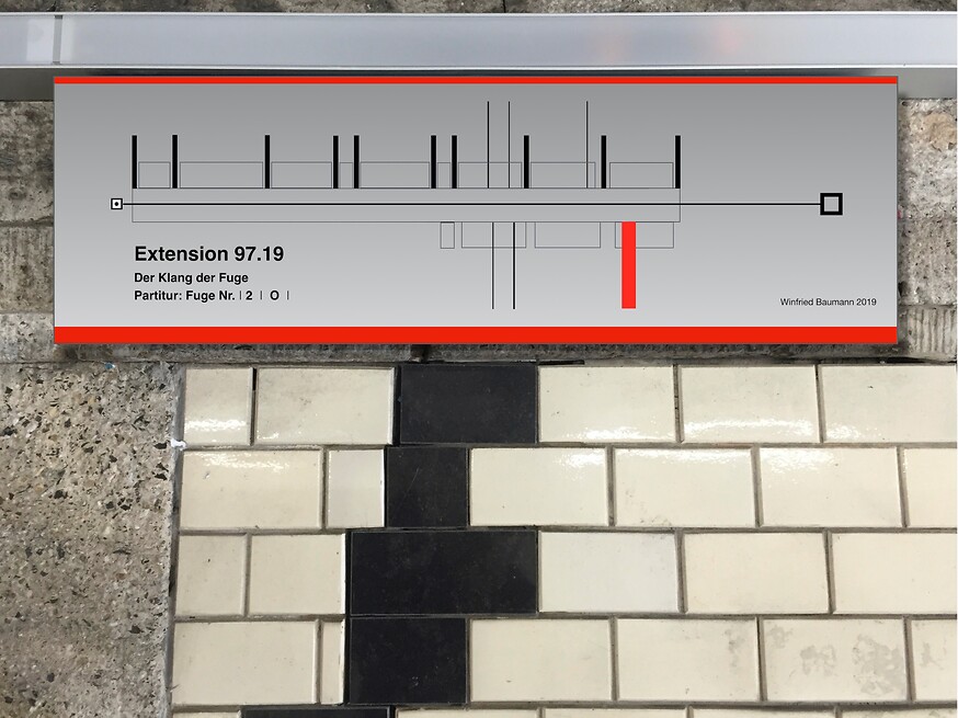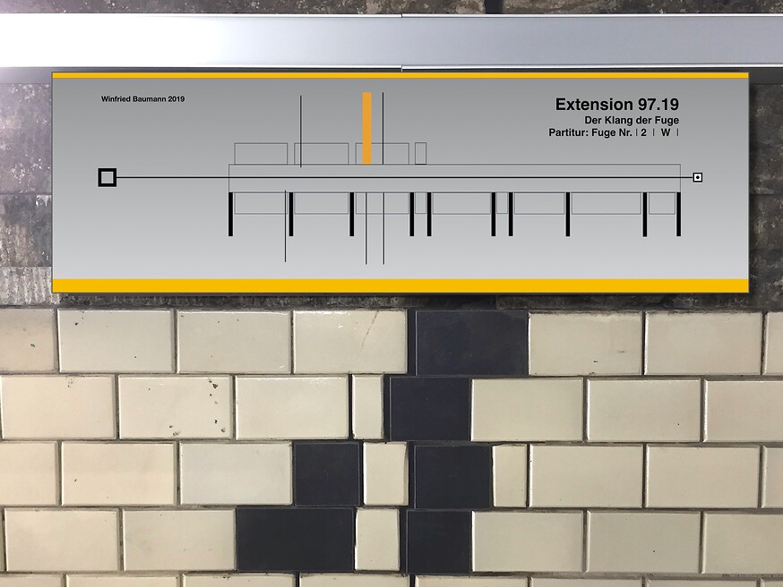 Durch das Ersetzen der schadhaften und fehlenden Wandfliesen mit schwarzen Fliesen entstand ein Wandbild gleich einer abstrakten Notenschrift. Eine Zufallskomposition deren Form offen ist, die sich auch in Zukunft weiter entwickeln und verändern wird. Die statischen Bewegungen in diesem Bereich können gemindert, aber nicht ausgeschlossen werden. Die Veränderungen werden einen dynamischen Verlauf nehmen und somit wird sich auch die Komposition verändern und zu immer wieder neuen Interpretationen führen.