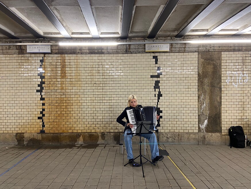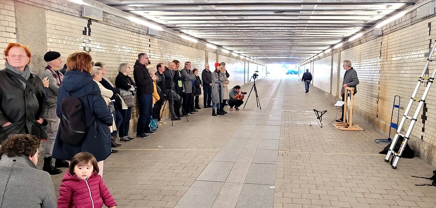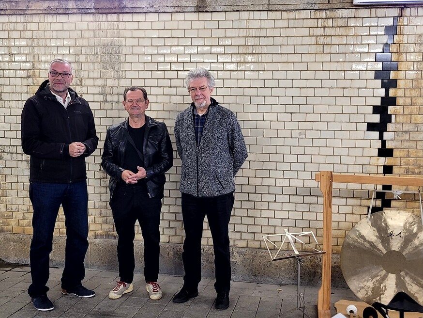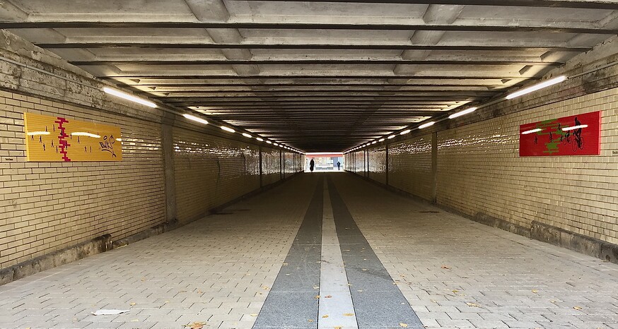 Durch verschiedene bauliche Veränderungen haben sich im südlichen Bereich des Karl-Bröger-Tunnels, an drei sich gegenüber liegenden Stellen Abrisse ergeben. Diese haben zu Schadstellen und Absprengungen an den Wandfliesen geführt. Verschiedene Experimente und Versuchsanordnungen im Tunnel haben so zu einer Komposition geführt, deren zentraler Bestandteil die drei Doppelfugen im südlichen Ausgangsbereich des Tunnels sind.